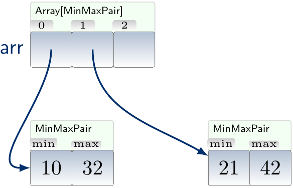 For an array of integer pair objects, the object diagram looks as following for Java and Scala. The third entry in the array on the right contains a null-reference not pointing to any object.