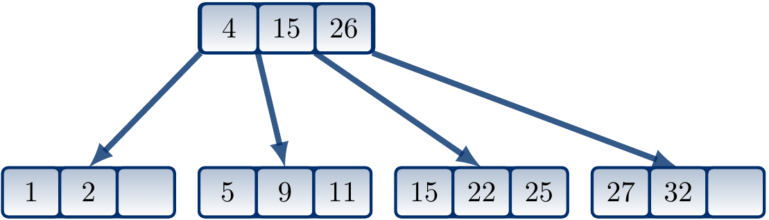 The leaf node is split in two and \(14\) is inserted in the latter. The “median” key \(11\) is inserted to the parent node of the leaf.