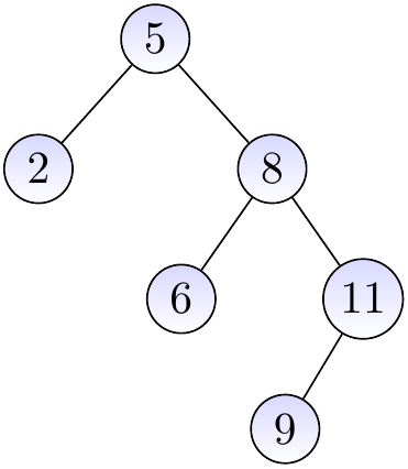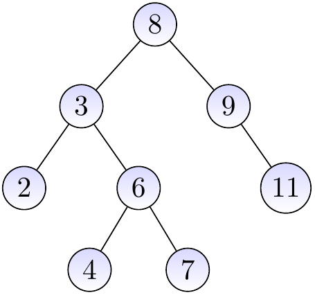 Due to the BST property, listing the elements/keys in ascending order is easy: just traverse the tree in inorder (recall the Section Traversing trees) and output the key of the node when it is visited. Thus \(n\) elements could be sorted by (i) inserting them one-by-one in a BST, and (ii) then listing the elements at the end. However, this would not be the most efficient sorting algorithm available.