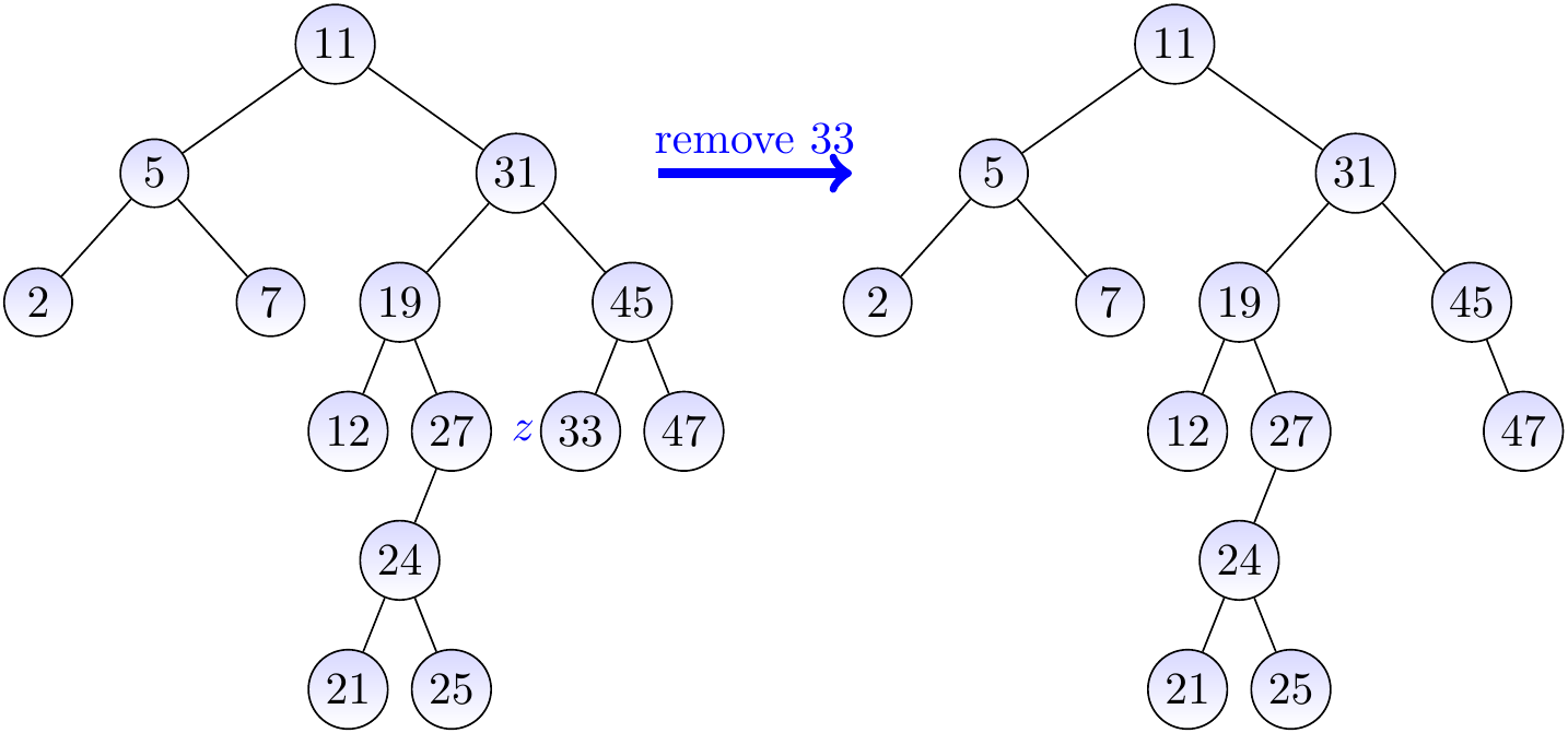 Let us remove the key 33 from the BST on the left-hand side below. In this case, we simply remove the node \(z\) having the key 33. The result is shown on the right hand side.
