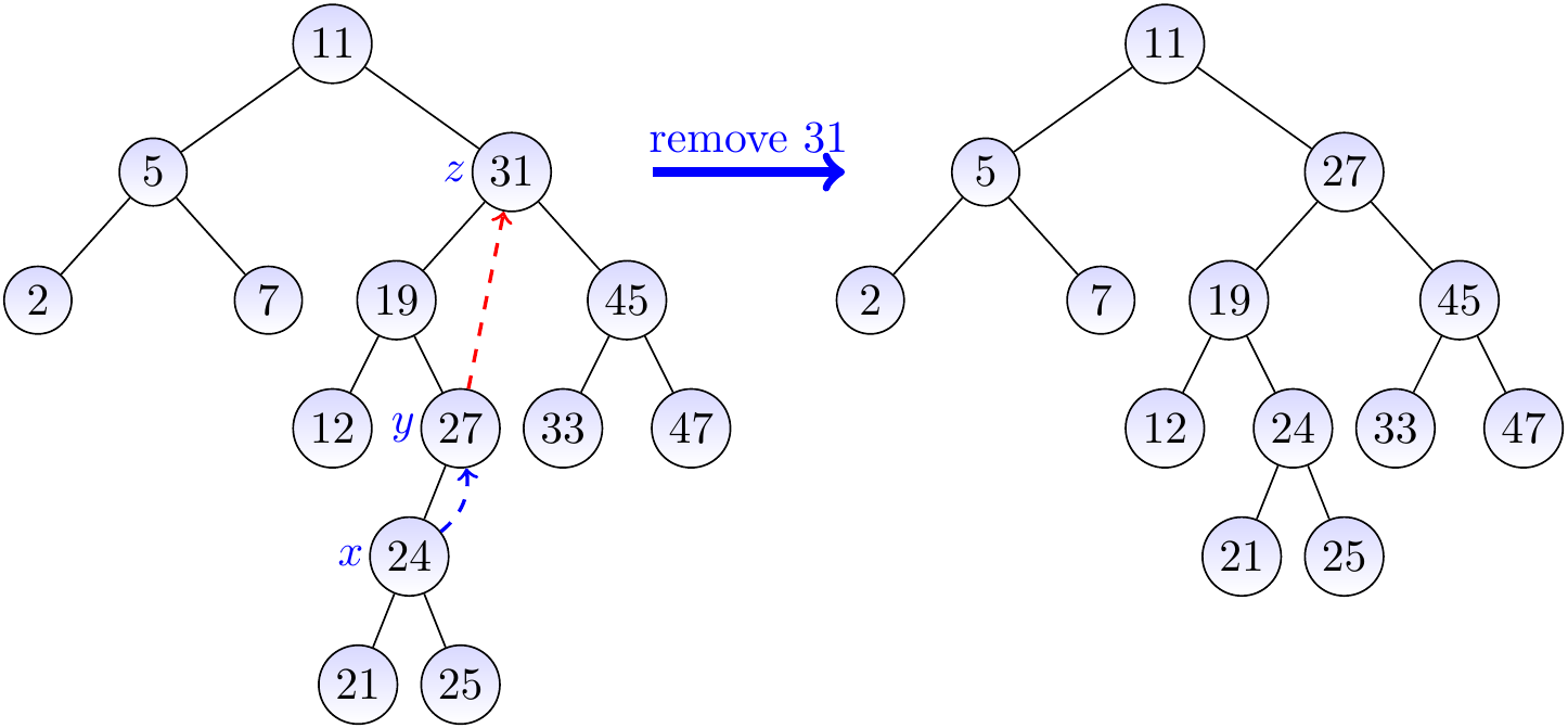 After this, we remove the node \(y\) and move its only child \(x\) to be in its place (shown with the blue dashed arrow).
