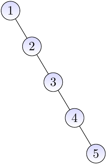 Inserting the keys 1, 2, 3, 4, and 5 in this order gives the BST shown below. This is essentially a linked list (the right child link corresponds to the next element link in linked lists).