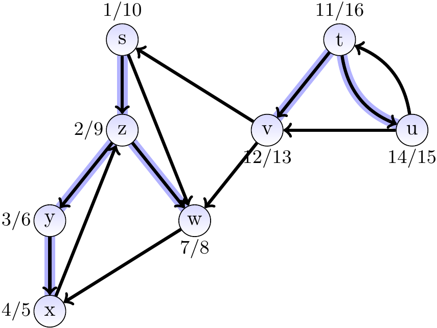 The sub-searches (calls to the visit function in the last line of the main procedure) start from the vertices in alphabetical order in this example so that the first visited vertex is \(s\). Again, the edges from a vertices are traversed in an arbitrary order. The pair \(a/b\) next to a vertex tells the start \(a\) and finish \(b\) timestamp of the vertex.