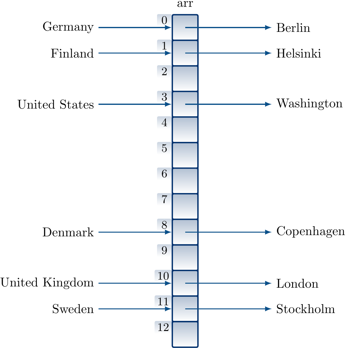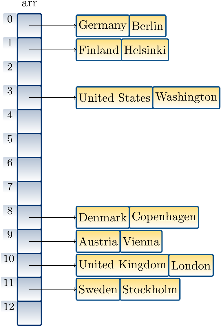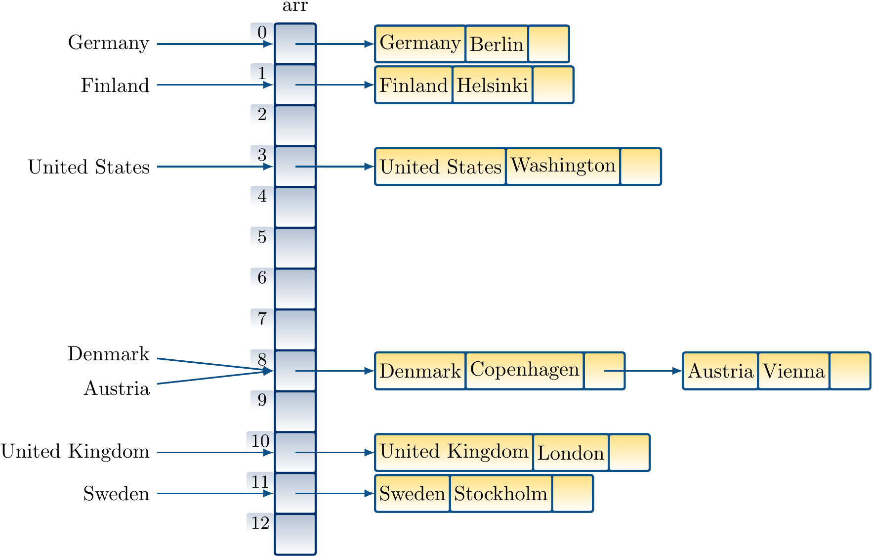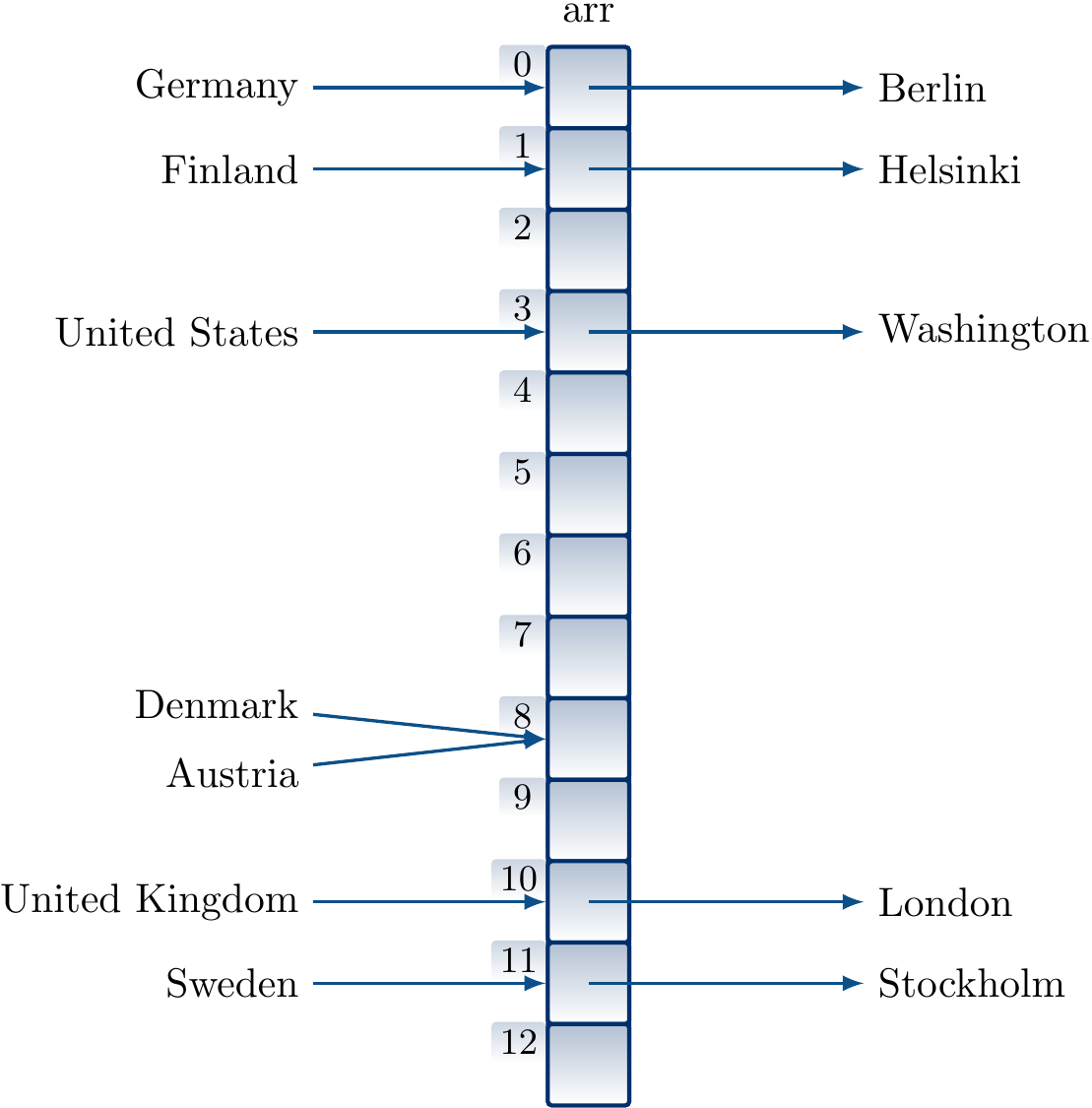 in a table of size 13 in this order by using our ealier hash function and linear probing gives the hash table below. When inserting the mapping “Austria ↦ Vienna”, we observe that the index 8 is already taken by Denmark, probe the next index 9, see that it is free, and insert the key/value pair there.