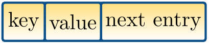 Chaining is a collision resolution method. It is also called separate chaining and open hashing in some texts. The idea in chaining is as follows: each entry in the hash table starts a linked list, and the key/value-pairs are stored in the list. After finding the index \(h(k)\), and thus the correct list for a key \(k\), the rest is as with mutable linked lists: