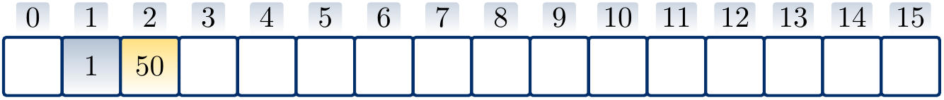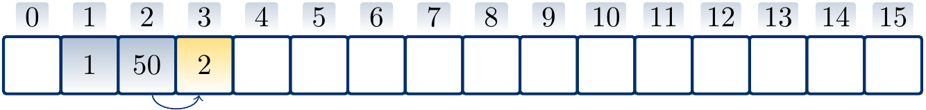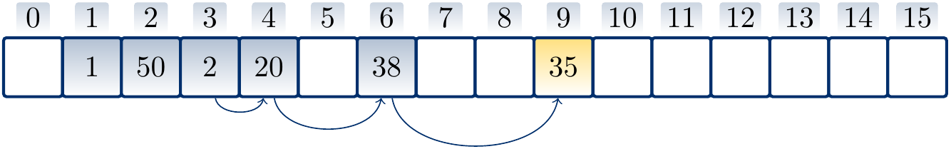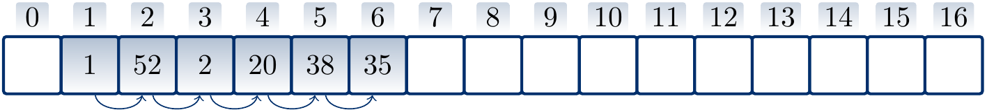 Suppose that \(h'(k) = k\) for integer-valued keys and \(m = 16\). Let us insert the values \(1\), \(50\), \(2\), \(20\), \(38\), \(35\) in this order with quadratic probing hash function \(h(k) = (h'(k) + \frac{i(i+1)}{2}) \bmod m\) to the empty hash table. Again, the arrows below the table show the applied probe sequences.