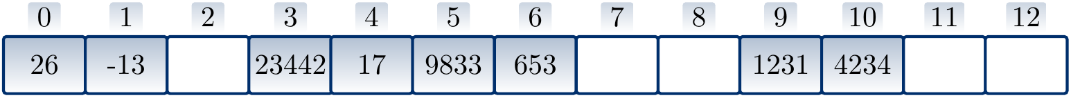 Inserting the numbers 1231, 9833, 23442, 26, 17, 4234, 653 and -13 in a “hash set” of integers with the hash function \(h(k) = k \bmod m\) produces the following hash table when \(m = 13\):