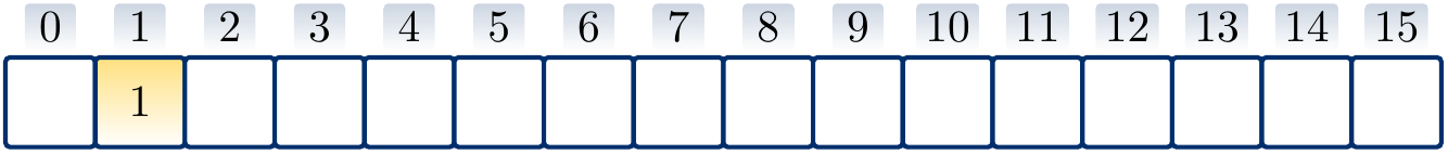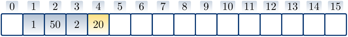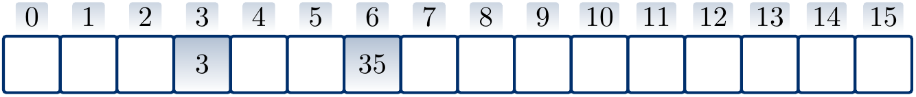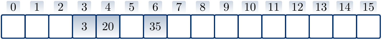 Suppose that \(h'(k) = k\) for integer-valued keys, \(m = 16\), and we use quadratic probing with the hash function \(h(k) = (h'(k) + \frac{i(i+1)}{2}) \bmod m\) to insert the keys \(3\), \(20\) and \(35\) in a hash table. The result is