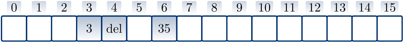 But in this hash table the search operation does not find the key \(35\) anymore as it probes the entries \(3\) and \(4\) only, concluding that the key is not in the set when it sees the free entry at the index \(4\).