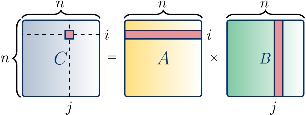 Let’s again recall the matrix multiplication example from the CS-A1120 Programming 2 course. The product of two \(n \times n\) matrices \(A = (a_{i,j})\) and \(B = (b_{i,j})\) is the \(n \times n\) matrix \(C = (c_{i,j})\) where
